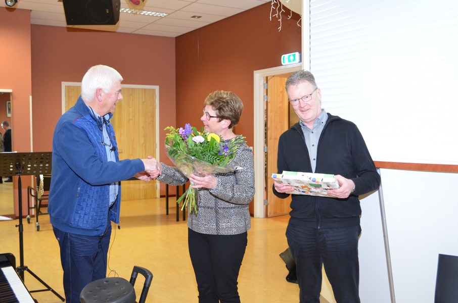 Van der Maten nam een tweetal boeken over treinen in ontvangst als cadeau, zijn vrouw Irma kreeg een bosje bloemen. Wat volgde was een applaus van de aanwezige leden. Van der Maten: “Een volslagen verrassing! Ik hoop nog geruime tijd jullie dirigent te mogen zijn, we hebben het heel goed met elkaar! Bedankt mannen!”